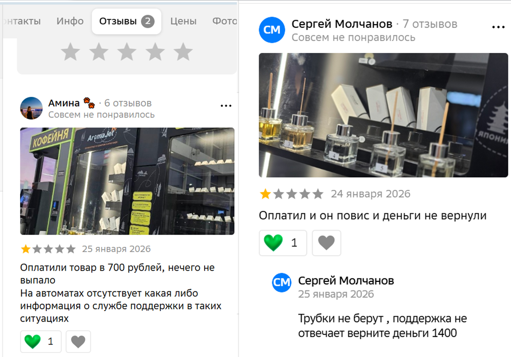 Встречаются оценки не только тех, кто покупал франшизу «Арома Джет», но и отзывы тех, кто пользовался аппаратами. Одна из клиенток пишет, что оплатила ₽700 за аромат, но из автомата «ничего не выпало». Второй пользователь поделился такой же историей, только сумма другая. Клиент заплатил ₽1,400, но парфюм не появился, а поддержка не отвечала.