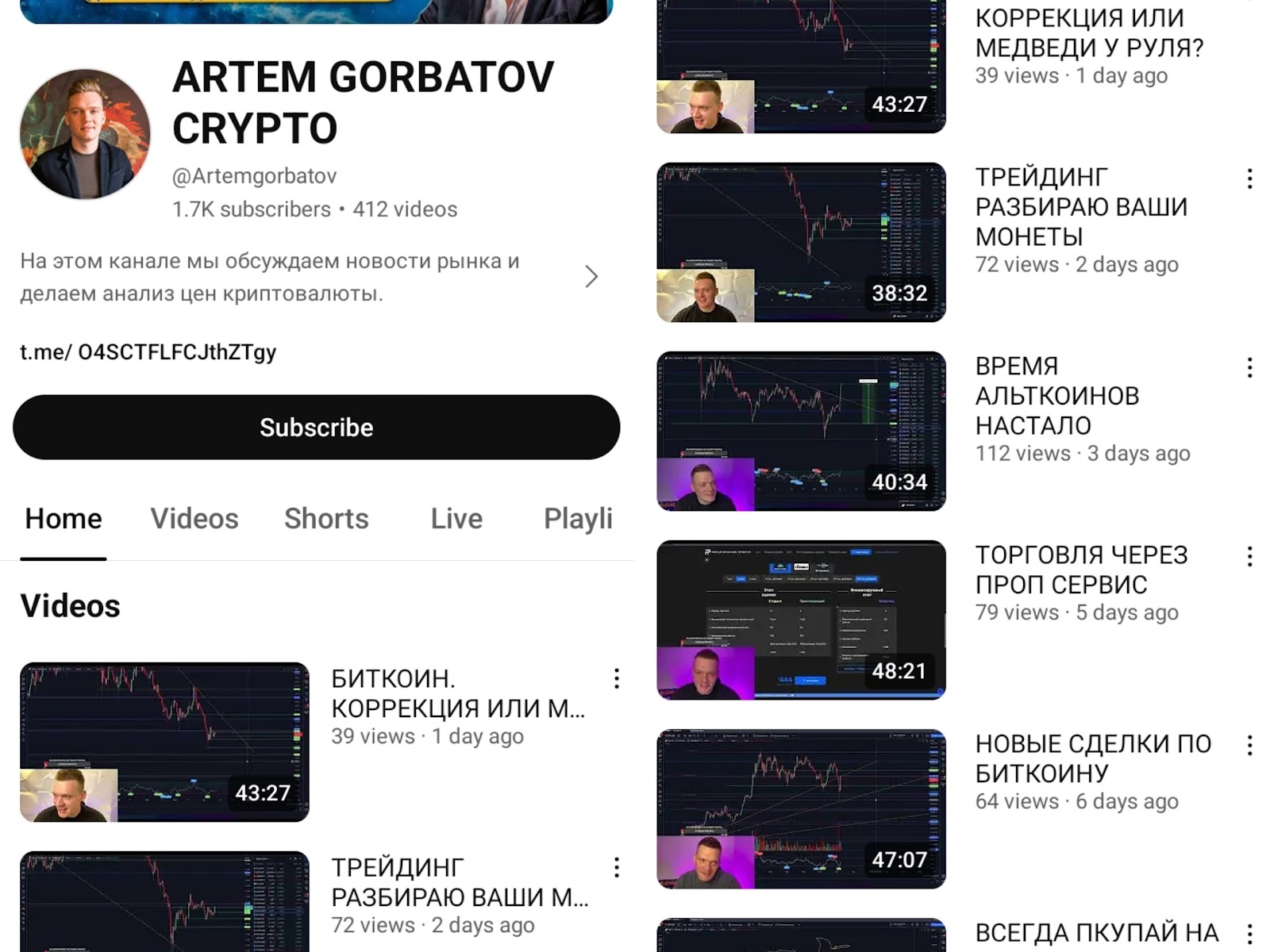 Ютуб канал Artemgorbatov (ARTEM GORBATOV CRYPTO) работает с июня 2018 года. Его аудитория — 1.7k пользователей.Сейчас здесь опубликовано 412 видео. Тематика посвящена разбору криптовалют и прогнозам.