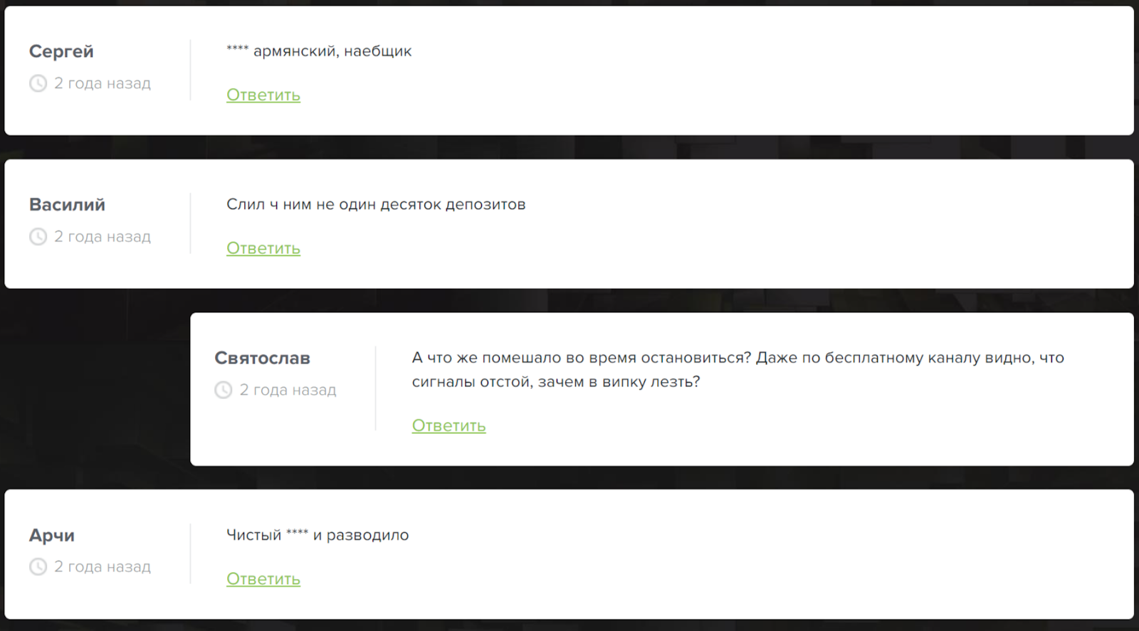 Если заглянуть на сторонние сайты, отзывы об Артуре Абрамове далеки от идеала. В них пользователи жалуются на качество сигналов, а иногда и вовсе отмечают, что трейдер — мошенник. При этом пользователи не рекомендуют с ним сотрудничать.