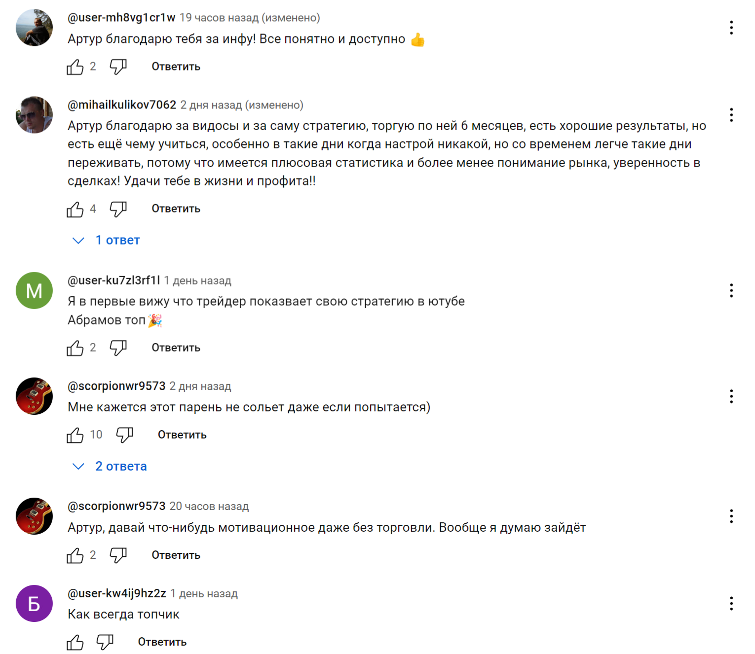 Для поиска отзывов о Artur Abramov можно использовать разные источники, в том числе сами сообщества автора. К примеру, под роликами в Ютубе можно найти множество позитивных мнений о деятельности трейдера. Пользователи благодарят за эффективную стратегию и подробное разъяснение.