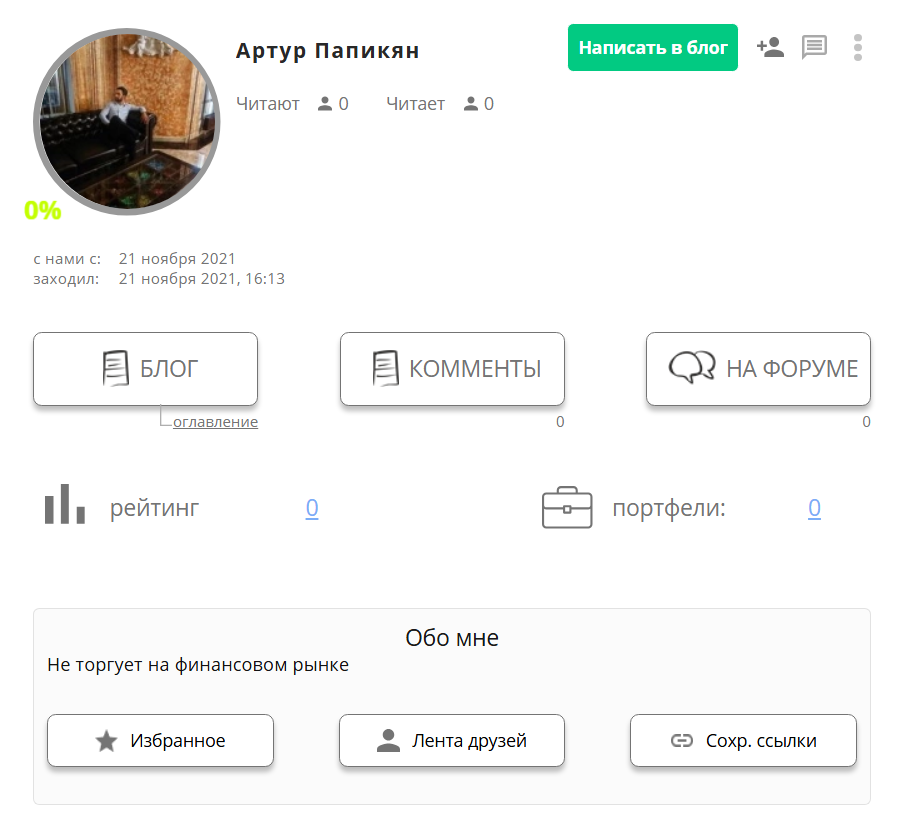Вероятно после этого специалист решил стартовать на Smart-lab, но хватило его только чтобы создать свой аккаунт ArturPapikyan 21 ноября 2021 года, после чего он больше ни разу не появился. Уже складывается впечатление не самого целеустремленного человека, которому доверить свои деньги будет довольно рискованной идеей.