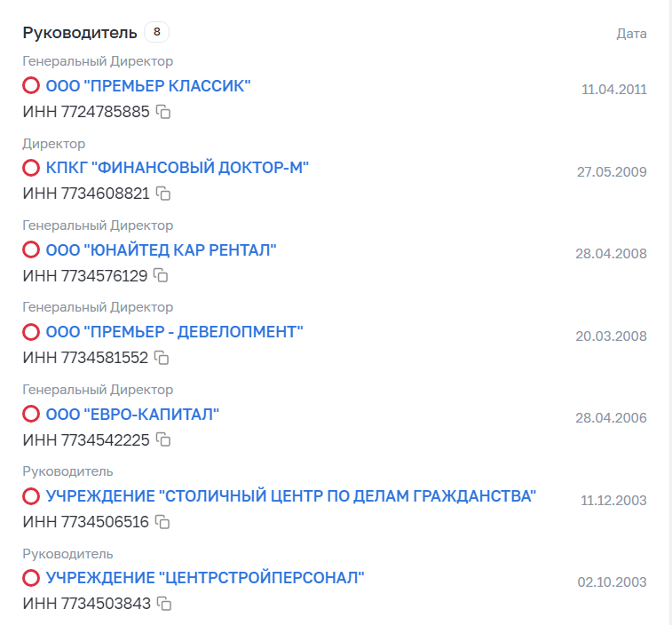 Ровно столько же компаний находились под его руководством, но все они на 2025 год ликвидированы.Причем они не просто были закрыты из-за убытков или других производственных проблем, а прошли через процедуру банкротства из-за огромных долгов в десятки миллионов рублей.