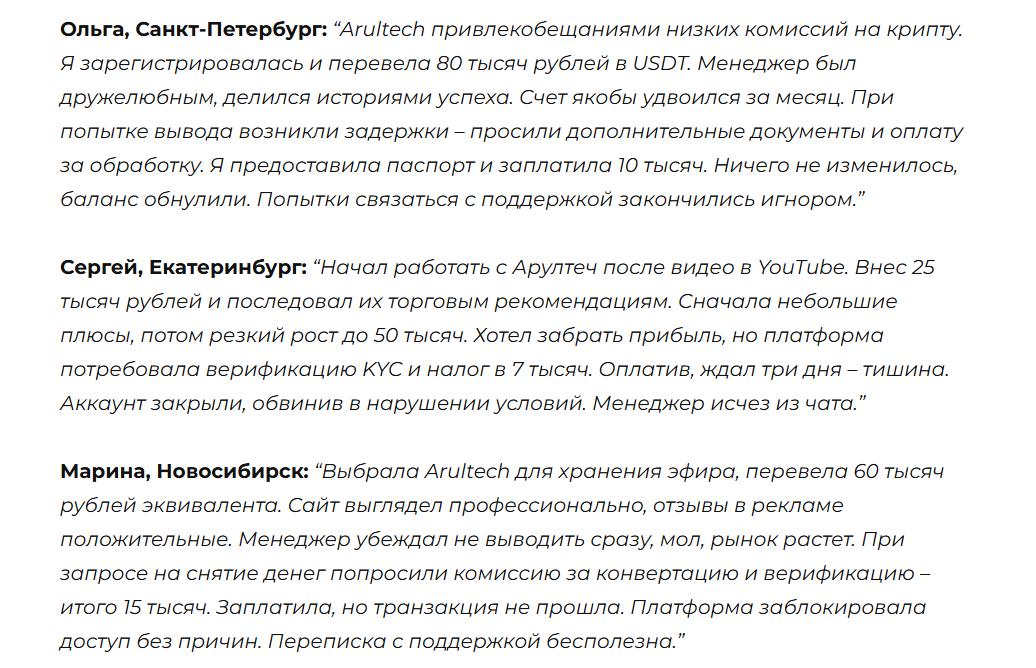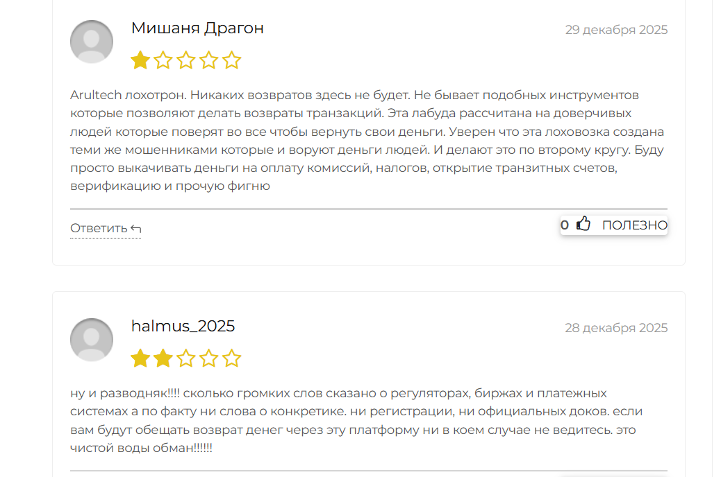 О проекте Arultech отзывов в сети немного. Те, что мы нашли — негативные. Пользователи сообщают, что менеджеры платформы сами звонят и предлагают помощь в возврате крипты, могут даже демонстрировать счета с готовыми к отправке суммами, но чтобы их получить надо оплатить стоимость услуги, налоги, комиссии. В конечном итоге, выплат никто так и не получил.