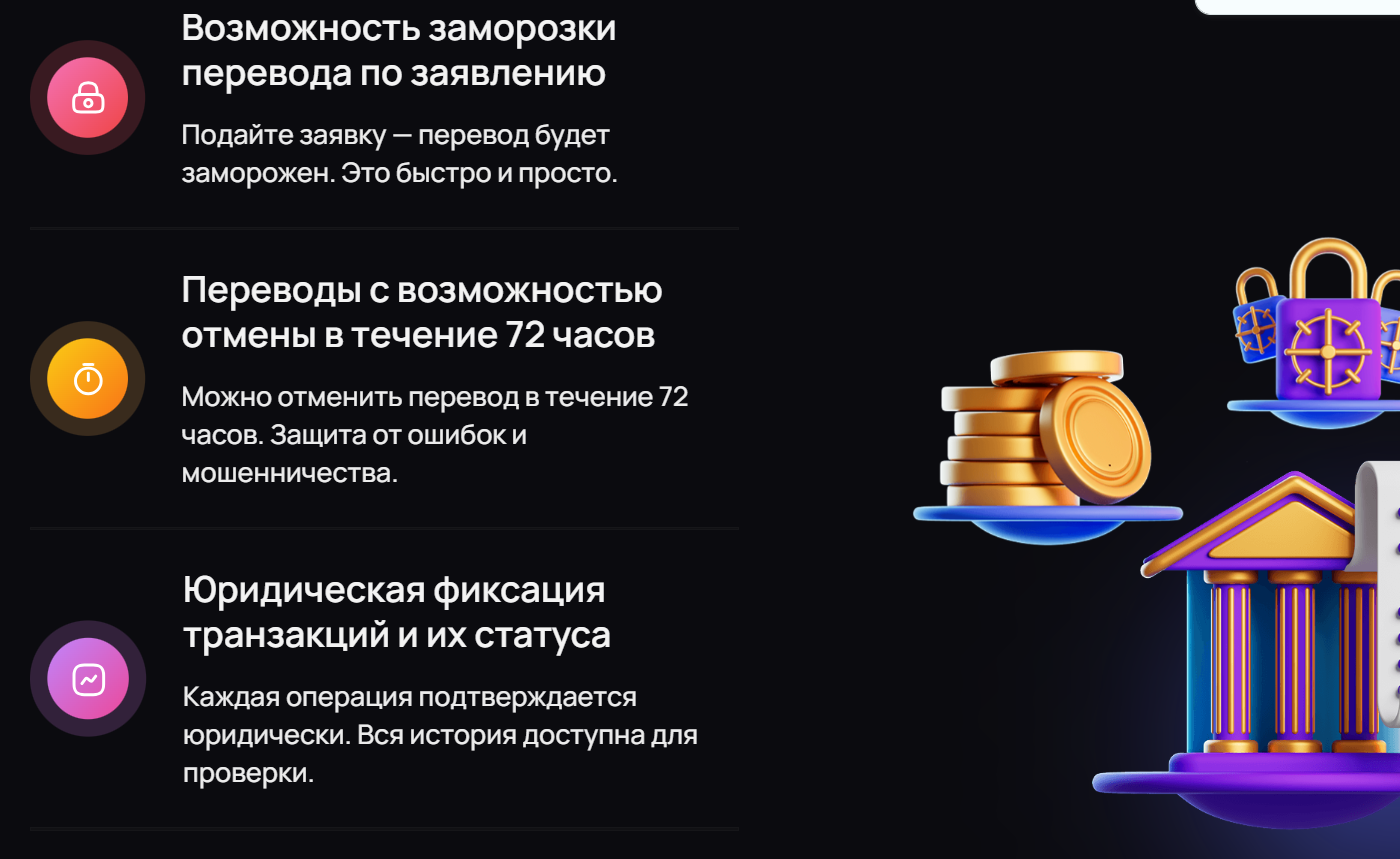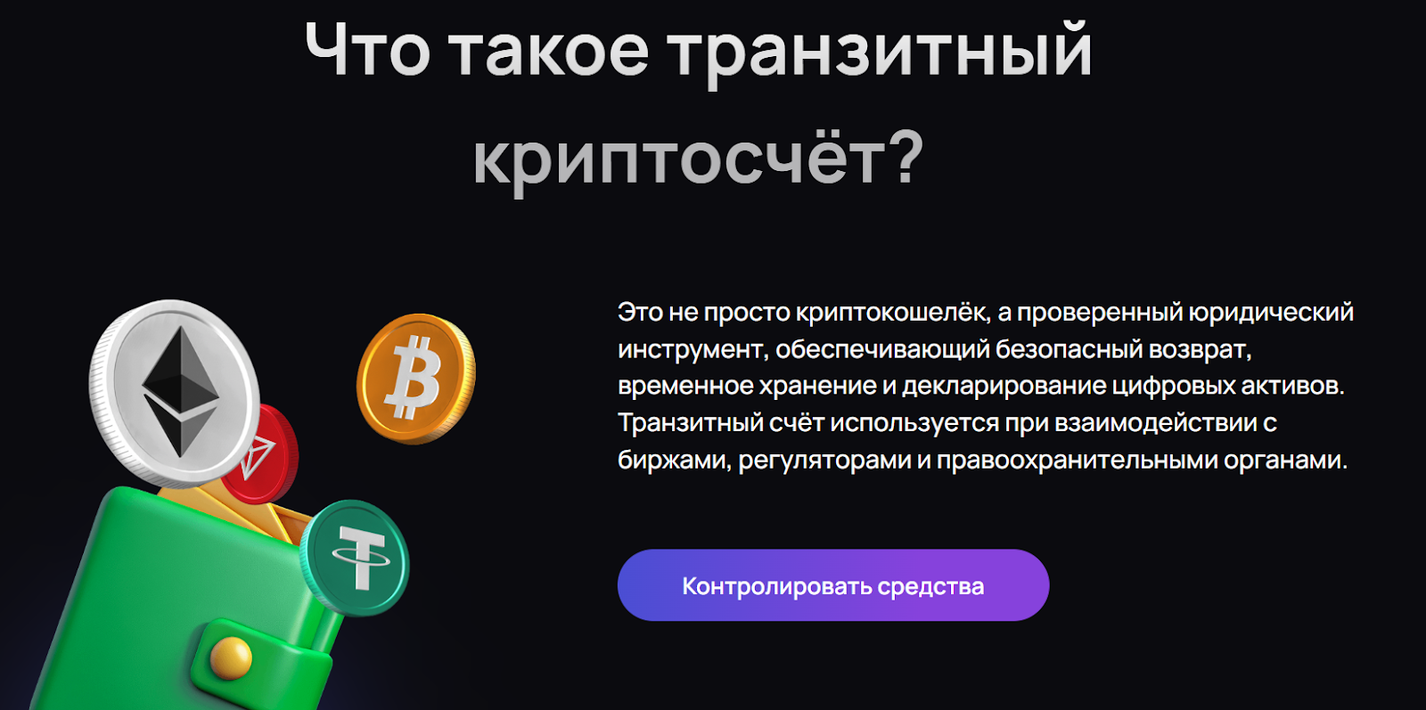 Ключевой инструмент платформы — так называемый транзитный счет. Владельцы его описывают как юридический инструмент для временного хранения, возврата и декларирования цифровых активов. В отличие от классического криптокошелька он взаимодействует не только с биржами, но и регулирующими и налоговыми органами.