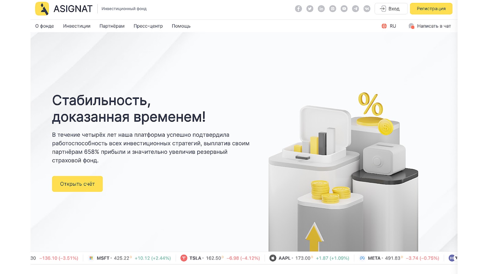 Компания работает через официальный ресурс asignat com. Его можно сменить на русский язык. Из категорий на сайте представлены: О Фонде, Инвестиции, Партнерам, Пресс-центр и Помощь.