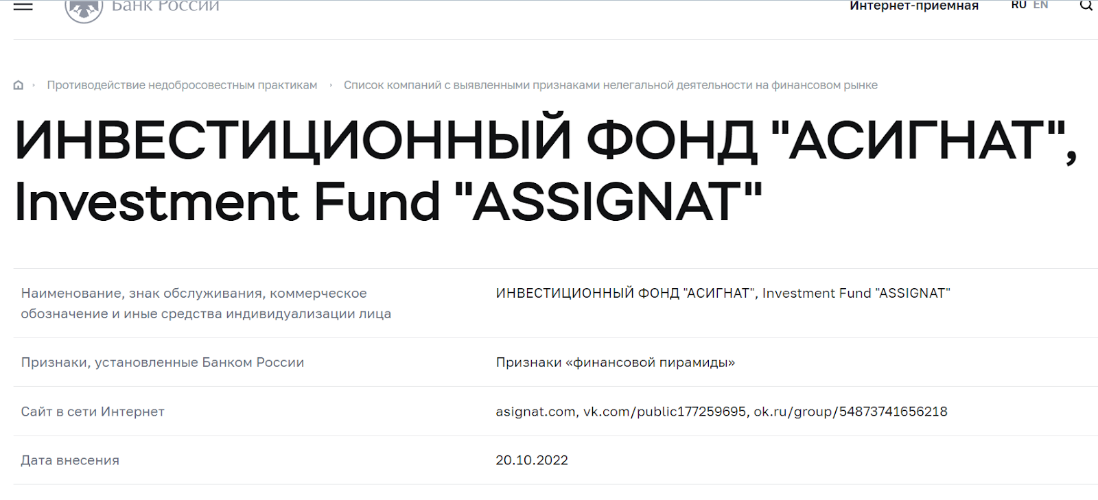 Компания Asignat заявляет о слишком высокой прибыли на инвестициях. Проект занесен в черный список ЦБ РФ и получил мошенническую репутацию в Сети. К признакам обмана со стороны инвестиционного фонда можно отнести следующее: