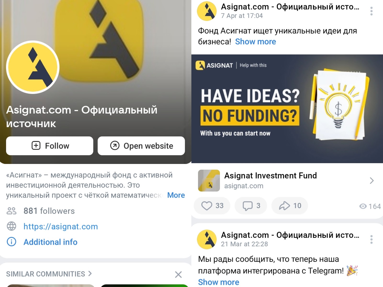 В паблике Asignatcom размещаются общие новости в области цифровых валют. Также админы информируют об изменениях в работе фонда. Например, в публикациях сообщается о том, что платформа теперь доступна в Телеграмме. В описании группы оставлена ссылка на консультанта. Им выступает Артур Игнатов (Artursignatov).