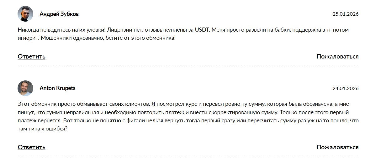 Проект не заслужил доверия. Домен зарегистрирован в январе 2026 года, сервис существует всего несколько месяцев. Статистика о десятках тысяч обменов явно не соответствует возрасту проекта. В сети накопилось множество негативных отзывов.