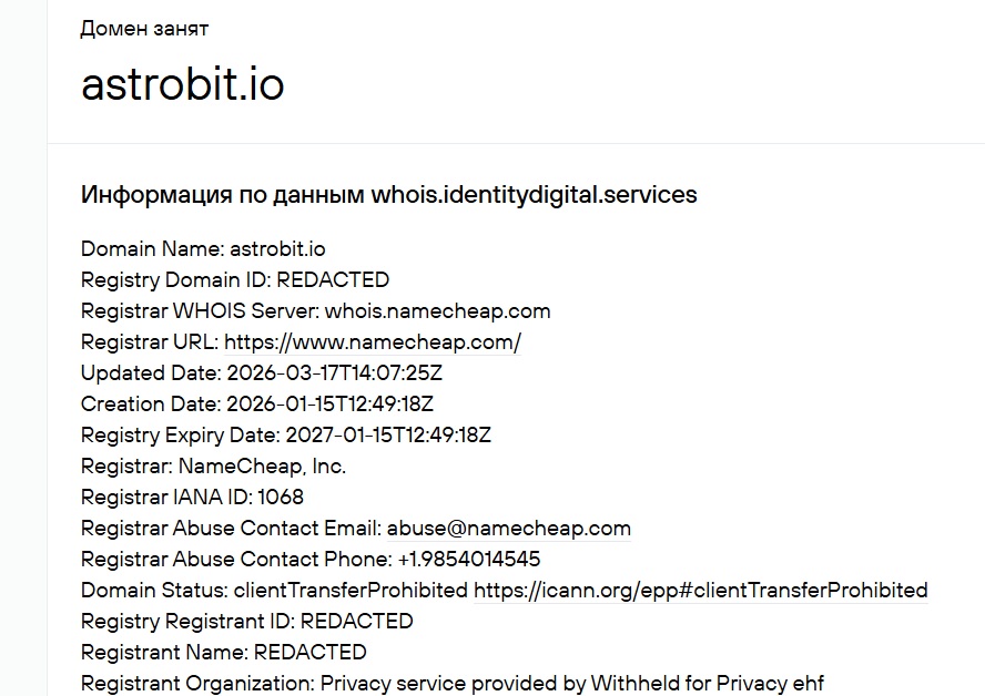 Данные WHOIS показывают, что домен astrobit.io зарегистрирован 15 января 2026 года. На момент написания обзора проекту всего несколько месяцев. При этом сервис заявляет о 2000 довольных клиентов за последний месяц, а также о более чем 10 тысячах пользователей и 50 тысячах обменов. Такие цифры выглядят несоразмерно возрасту домена и вызывают сомнения.