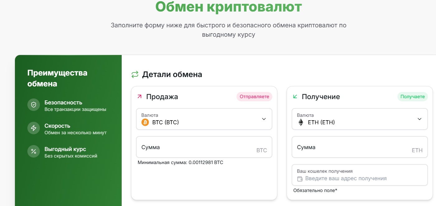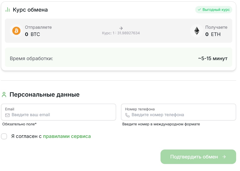 На главной странице размещена форма, где нужно выбрать валюту, указать сумму и адрес кошелька. Система показывает примерный курс и предлагает подтвердить заявку. Сервис обещает, что обмен занимает от 5 до 15 минут.