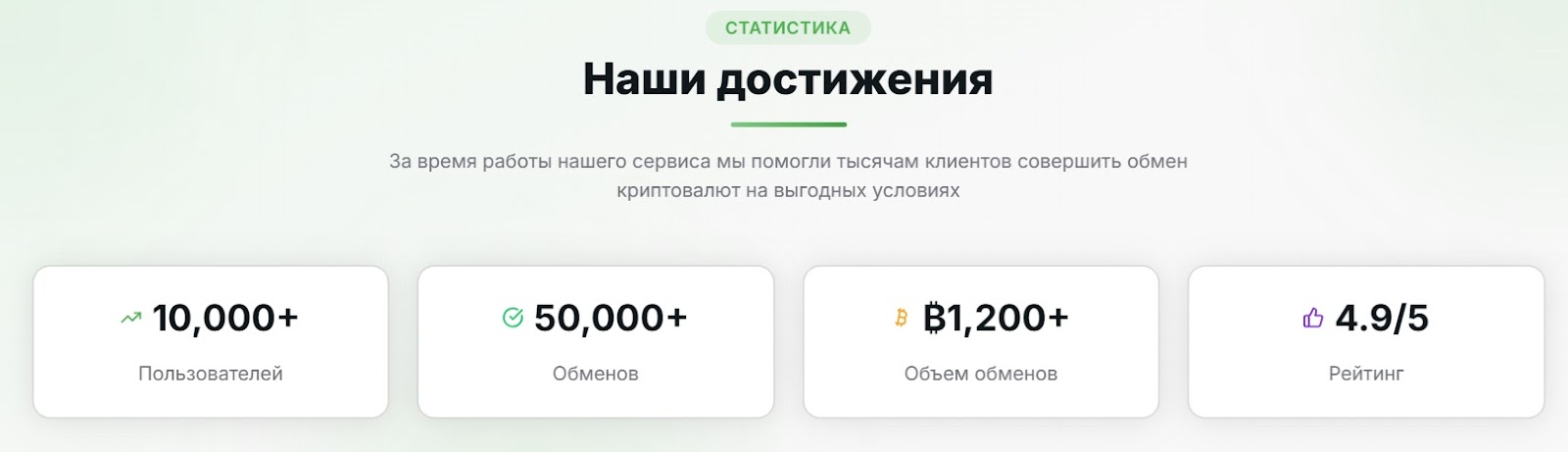 Доступа к отчетности о проведенных сделках проект не предоставляет. Статистика на сайте — 10 тысяч пользователей, 50 тысяч обменов, рейтинг 4.9 — существует только в виде цифр и не подлежит независимой проверке.