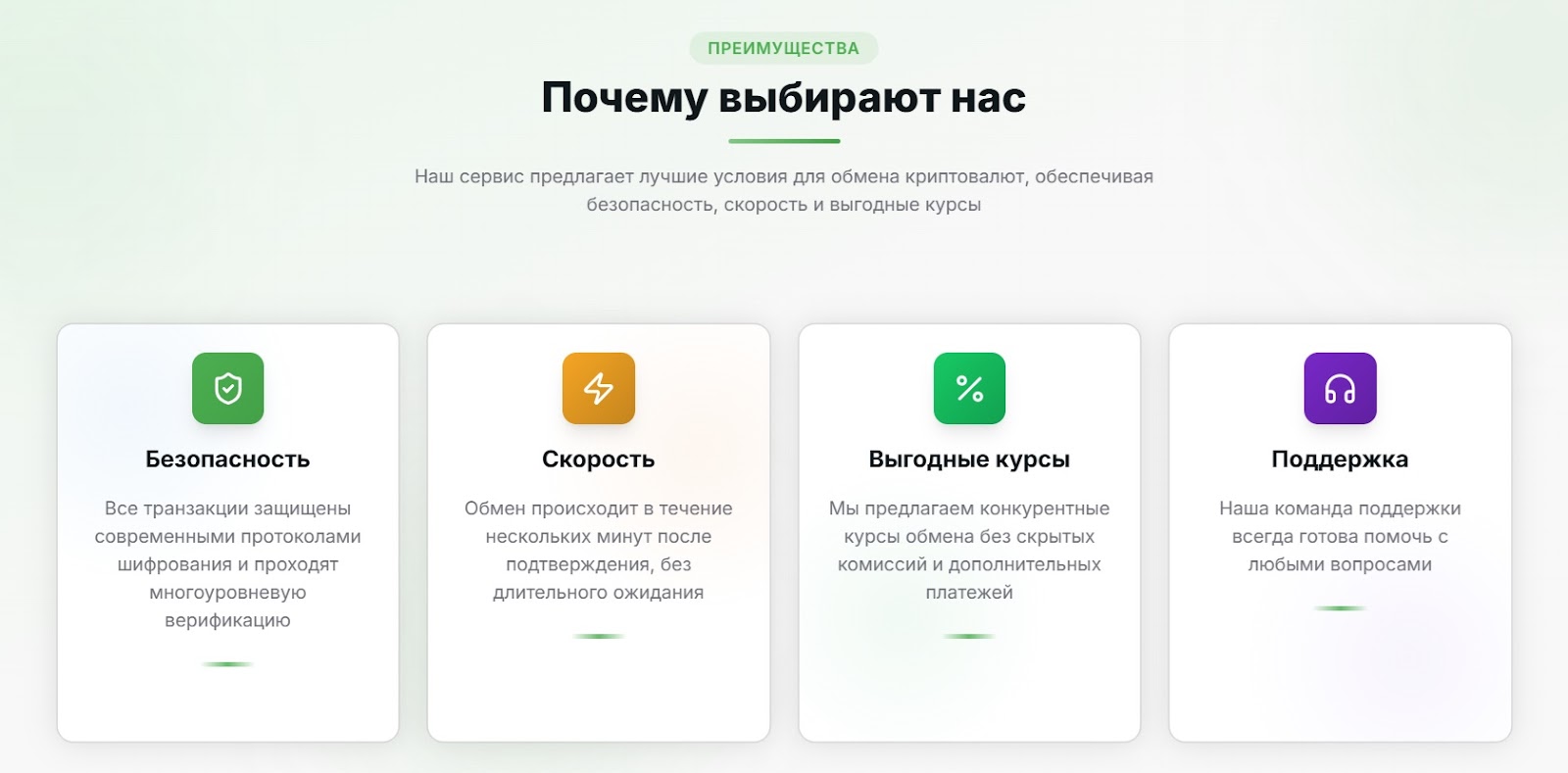 AstroBit называет себя надежным сервисом с выгодными условиями. В блоке с преимуществами авторы делают ставку на безопасность через современное шифрование, скорость обмена за несколько минут, честные курсы без скрытых комиссий и поддержку круглосуточно. Но никаких доказательств этим словам — ни лицензий, ни отчетов, ни независимых проверок — нет.