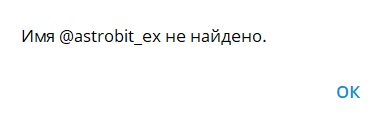 В открытых источниках заявлен Telegram-аккаунт @astrobit ex, через который авторы обещают круглосуточную поддержку. Однако при попытке найти этот канал обнаруживается, что пользователя с таким именем в Telegram не существует. Аккаунт либо удален, либо указан некорректно, либо вовсе не создавался. Обещанная поддержка оказывается недоступной.