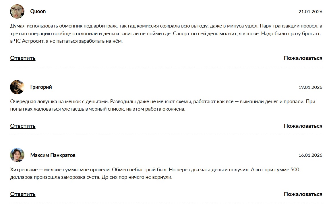 В сети преобладают негативные отзывы о сервисе AstroBit. Пользователи на независимых площадках называют проект мошенническим и предупреждают других от обращения к нему. Обещания выгодных курсов и быстрого обмена не подтверждаются реальным опытом клиентов.