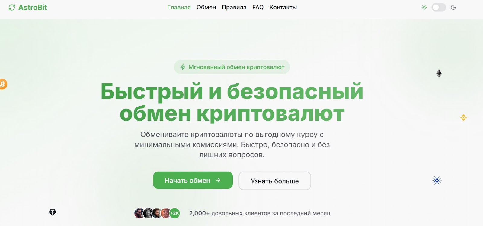 Главная площадка проекта — сайт astrobit.io. Оформление выполнено в современном минималистичном стиле: светлый фон, четкие блоки, акцент на форму обмена. Контент выглядит презентабельно, но содержит много общих фраз без конкретики. По сути, это типичный лендинг, цель которого — вызвать доверие и подтолкнуть посетителя к оформлению заявки.