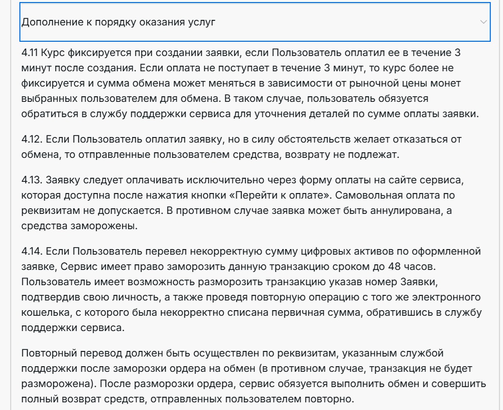 При детальном изучении правил всплывают нюансы. Курс фиксируется только если пользователь оплачивает заявку в течение трех минут. Если уложиться не получается, сумма обмена может измениться. Уточнять новые условия предлагается через службу поддержки, которая, как выяснилось ранее, недоступна.