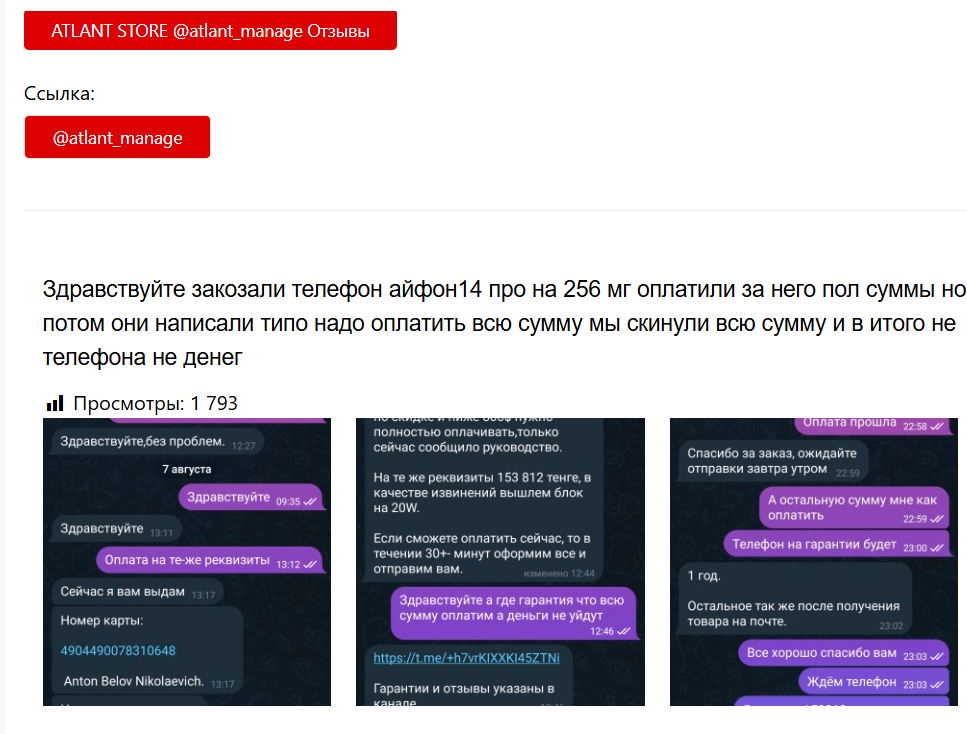 Главная опасность Atlant Store телеграмм (разоблачение, как правило, не заставляет себя долго ждать) в том, что весь проект держится на доверии к “картинке”. Низкие цены, громкие акции и обещания быстрой доставки формируют ощущение реальной торговой площадки, но под этим нет фундамента в виде компании с регистрацией, документов или юридических гарантий.