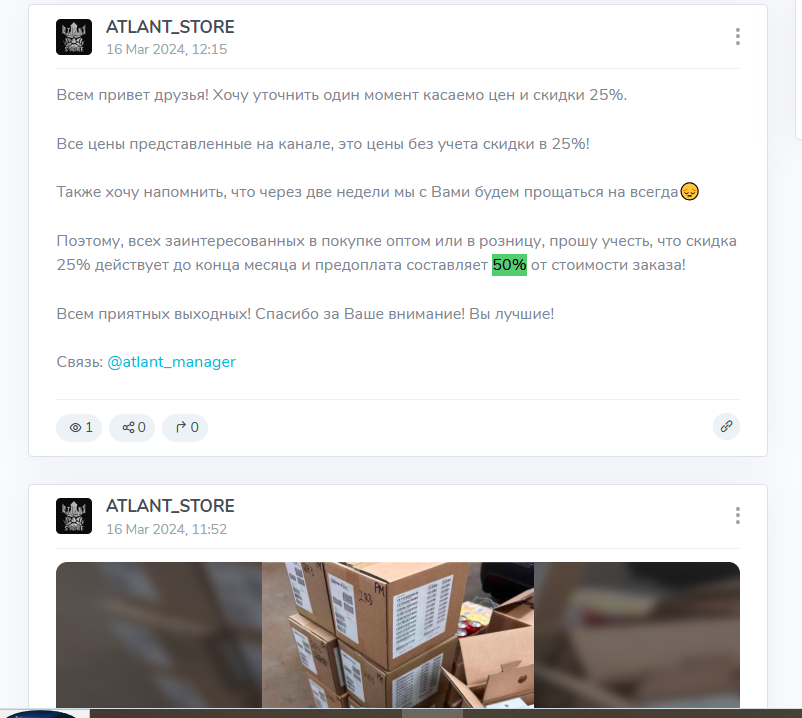Схема работы проста: оплата подразумевала предоплату — до половины суммы заказа. Дальше клиенту предлагали общаться с менеджером в ТГ под ником @ atlant manager, обещали быструю доставку по России и СНГ, а в Москву и Санкт-Петербург товар якобы доезжал за 24-48 часов.