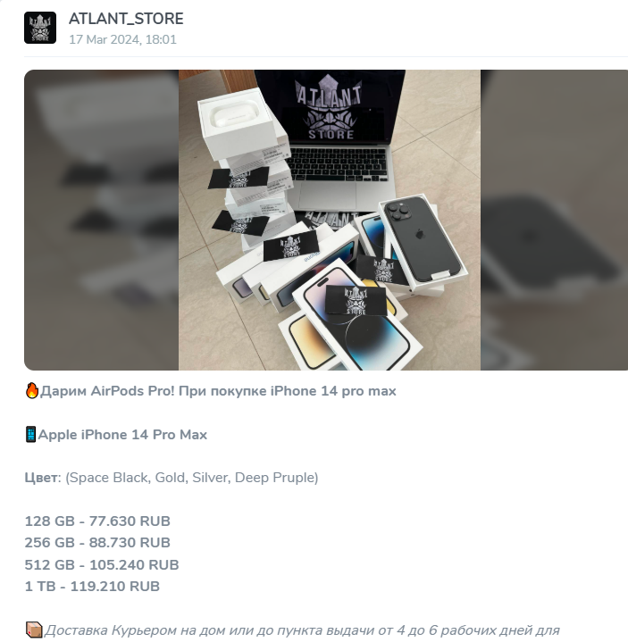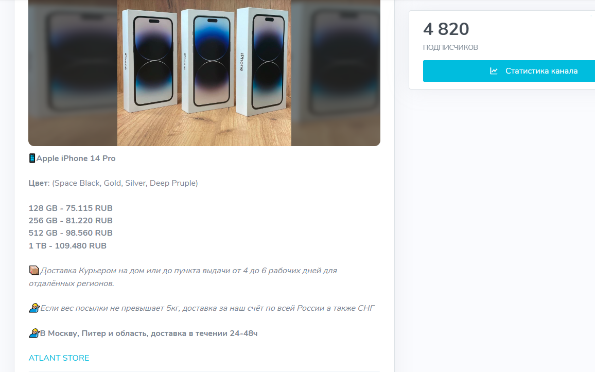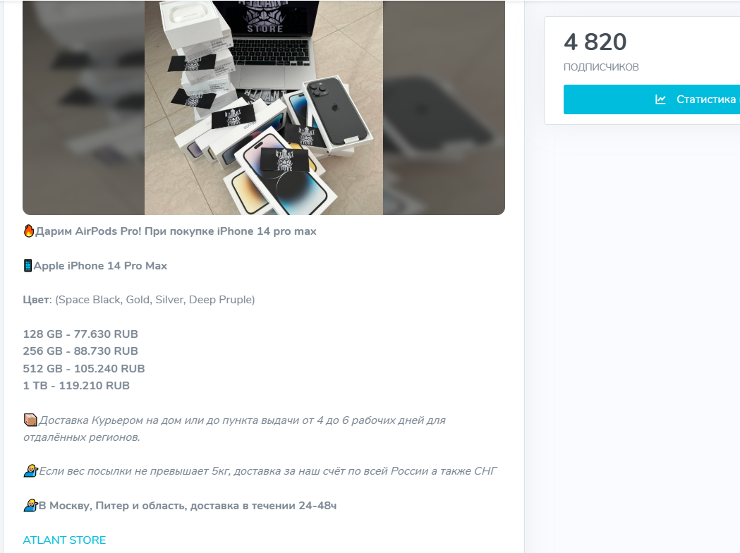 Atlant Store — телеграмм проект, который заявляет о себе как о магазине оригинальной техники с ценами на треть ниже рынка и бесплатной доставкой по всей России, но в сети часто встречаются его разоблачения.