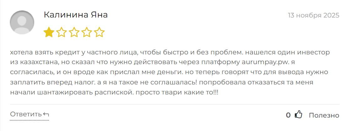 Отзывы о платформе aurumpay pw в интернете негативные. Люди подтверждают, что это мошенническая платформа. Но их словам, на нее заманивают псевдо-инвесторы. Вывести деньги с этой площадки нельзя, аферисты постоянно просят внести разные выдуманные платежи.