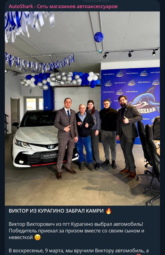 Основная аудитория магазина находится в паблике VK Автошарк — Сеть магазинов автоаксессуаров, на которые подписаны 63 000 человек. Еще 38 000 подписчиков у Телеграм-канала. Создатели магазина публичны, периодически выкладывают фото и видео с выдачи призов победителям.