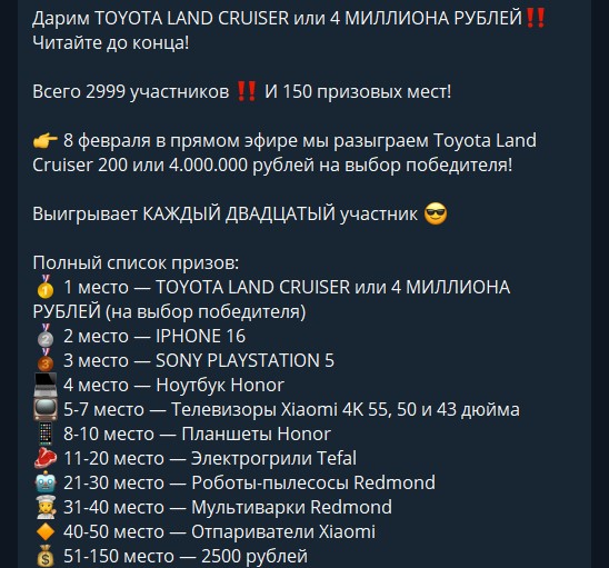 Но сами розыгрыши выглядят подозрительно. Магазин автоаксессуаров из маленького городка разыгрывает дорогие машины вроде Toyota Camry или Toyota Land Cruiser. В некоторых розыгрышах предлагают по 4 млн рублей или десятки призов, включая телефоны, ноутбуки, мультиварки и прочее.