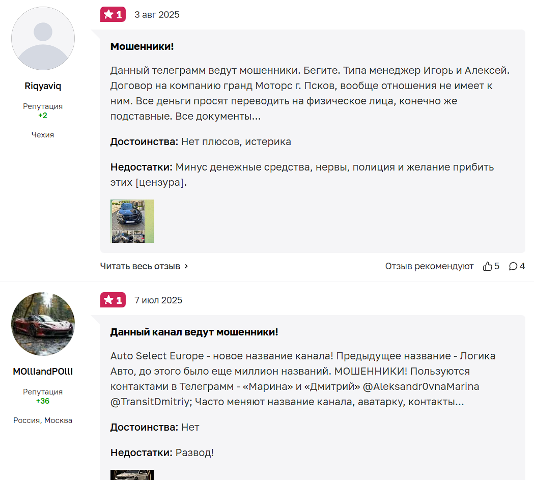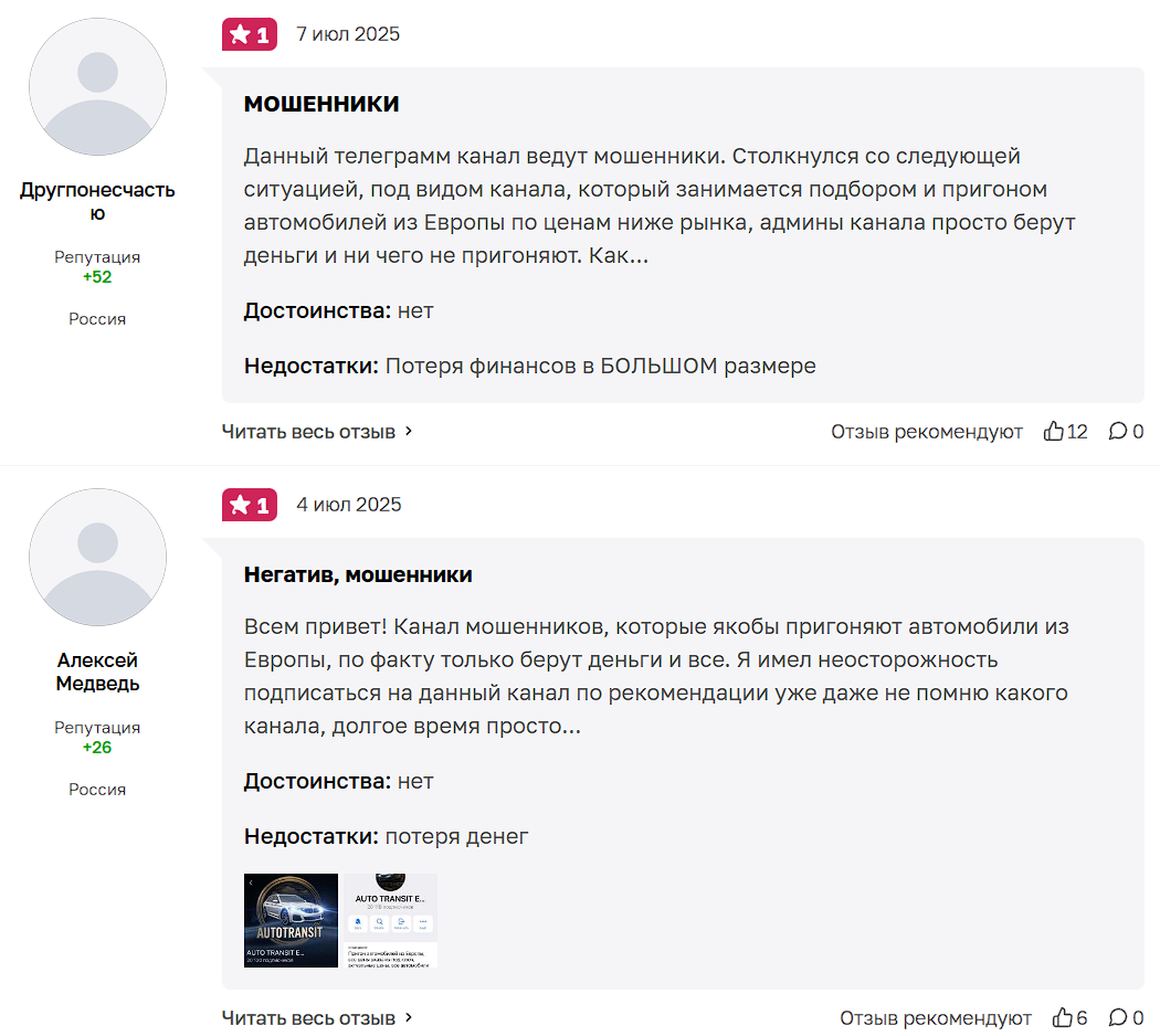 В открытом доступе есть строго негативные отзывы о данном телеграмм канале. Пользователи прямо говорят, что Авто Транзит — развод на деньги, призывают не верить их обещаниям.