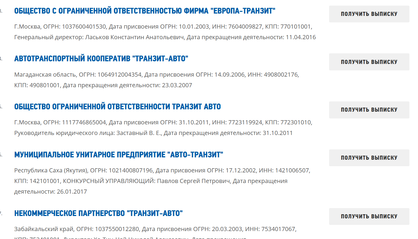 Одноименные юрлица в реестровых агрегаторах действительно существуют, но это лишь компании с названием «Авто-Транзит», а их автоматическая привязка к телеграмм-магазину не подтверждается: по одному из таких юрлиц даже указано, что официальный сайт, телефон и e-mail отсутствуют в ЕГРЮЛ.Что продавал проект