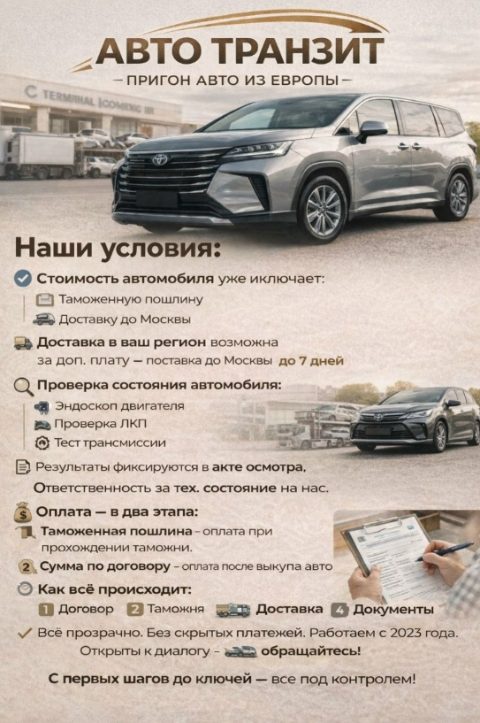 Проект «АвтоТранзит Европа» описывал свою модель работы как сервис по пригону автомобилей из Европы с включенной в базовую стоимость таможенной пошлиной и доставкой до Москвы, при этом доставка в другие регионы предлагалась за отдельную плату со сроком до 7 дней. В блоке условий отдельно подчеркивалось, что перед передачей машины проводилась проверка состояния автомобиля, включая эндоскопию двигателя, проверку ЛКП и тест трансмиссии, а результаты обещали фиксировать в акте осмотра, заявляя, что ответственность за техническое состояние компания брала на себя.