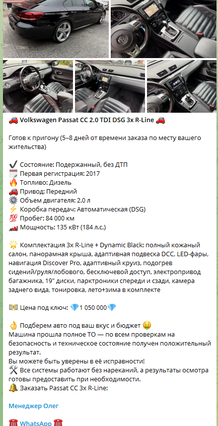 В завершении каждого поста размещается однотипный призыв к действию, контакт менеджера, ссылка на WhatsApp и заверение в прозрачности сделки. Повторяющиеся формулировки, идентичные описания, отсутствие различий в сценариях покупки говорит о том, что менеджеры проекта сами автомобили не осматривают. Они работают по заранее заданным шаблонам.