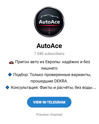 Клиентам предлагают подбор, осмотр, оформление и доставку автомобиля из Европы. На канале публикуются объявления с характеристиками, ценой по ключ и сроком доставки 5–8 дней. Сопровождение осуществляется через менеджеров, среди которых упоминаются разные контакты — @OlegAutoPrigon и @AlexandrAutoEUR. Ранее в проекте использовались иные ники. Условия сделки в Auto Ace не раскрыты.