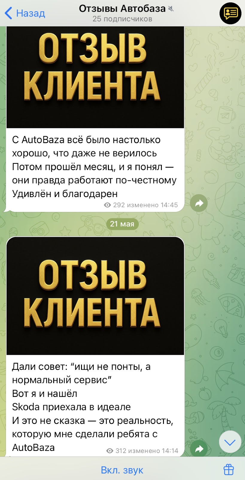 У Autobaza есть Телеграмм канал с отзывами на 25 подписчиков, в том числе и видео-формате.