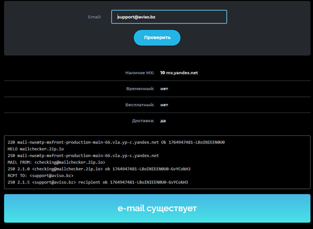 На любом сайте для проверки домена не удалось проверить адрес бота Aviso. На сайте указано, что команда работает уже 7 лет. Но при этом у них закрытый адрес, который нельзя проверить. Наиболее тревожным является предположение о том, что компания может скрывать информацию о боте из-за использования им нестандартных методов сбора данных. Это может включать в себя нарушение конфиденциальности пользователей, сбор информации без явного согласия или использование уязвимостей.Служба поддержки AvisoBz