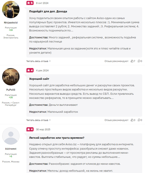 Отзывы о заработке Aviso Bz разные. Сначала разберем положительные. Из достоинств платформы пользователи выделяют множество разнообразных заданий, реферальную программу и возможность подъема по карьерной лестнице. Но кроме этого инвесторы нашли и недостатки. Например, маленькая цена за сложные задания. Но, несмотря на это, эти клиенты все равно поставили 4-5 звезд площадке. Люди считают, что для дополнительного заработка подходит.