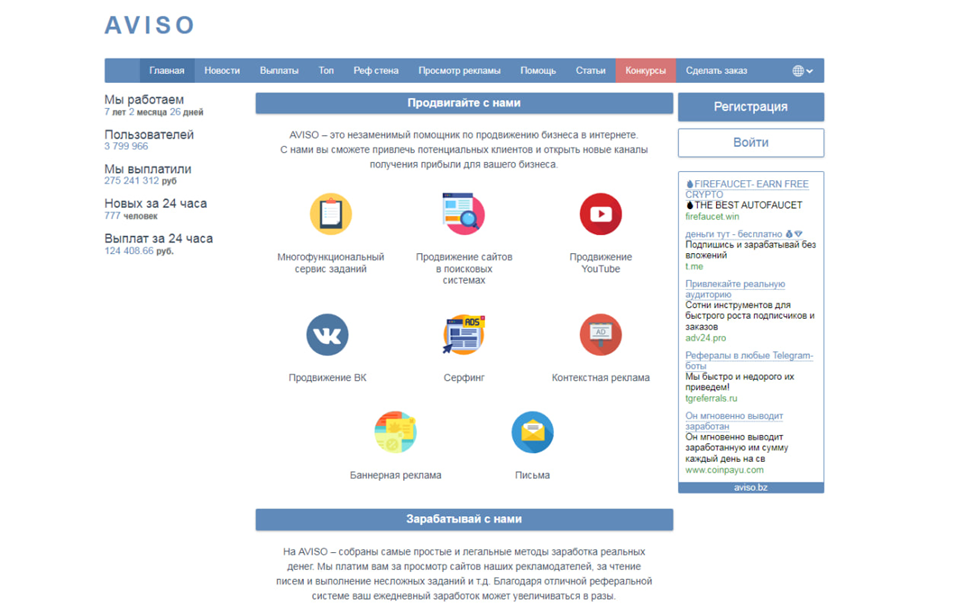 На сайте представлены легкие и прозрачные идеи для заработка настоящей прибыли. Владельцы выплачивают инвесторам определенные суммы за просмотр рекламы, писем и некоторых сервисов, за выполнение разных задач. С помощью реферальной программы эта прибыль может стать гораздо больше. В этом обзоре мы проанализируем деятельность платформы и узнаем, чем недовольны пользователи. Также вычислим, почему бывшие клиенты площадки считают, что Aviso – скам.