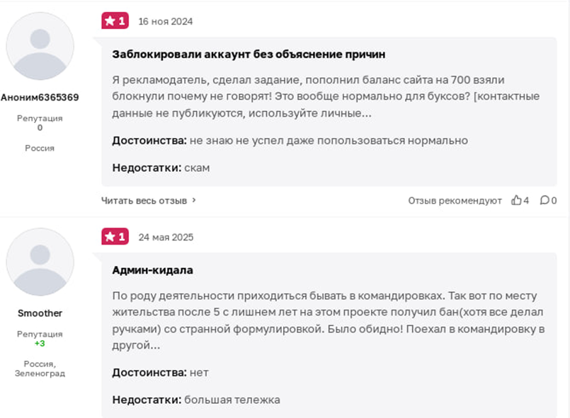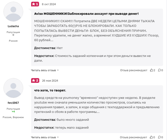Отрицательных отзывов об Aviso достаточно. Клиенты указывают на то, что админы блокируют аккаунты без причин, не отвечают на вопросы по этой теме и не дают пользоваться платформой. Некоторым пользователям не дали вывести даже самую маленькую сумму денег. Другие жалуются на то, что было много заданий, а теперь мало. Это противоречит положительному мнению других пользователей, которые в достоинствах указали множество и разнообразие задач. Есть вероятность, что хорошие комментарии подкуплены.