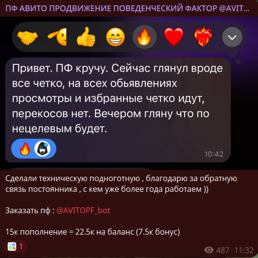 Собственно, на канале: ПФ АВИТО ПРОДВИЖЕНИЕ ПОВЕДЕНЧЕСКИЙ ФАКТОР AVITOPF bot, – находится 1,5 тысячи подписчиков, просмотры вертятся на том же уровне, даже немного больше: 1100-1800 глаз на пост. Комментарии отключены, а реакции поставлены авторские.Контент Avito PF otzizi не структурирован и ощущается как каша. Большинство постов написаны стеной текста, с повторами и размытыми формулировками, что затрудняет считывание информации. Тем не менее удалось вычленить несколько повторяющихся тем: