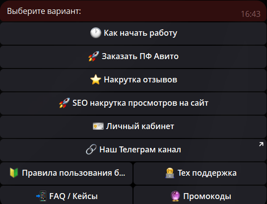 Авито ПФ – бот в телеграмме, предоставляющий услуги накрутки трафика не только на сервис Avito, а также на личные сайты и социальные сети. Проект существует уже более 2 лет, однако базу отзывов так и не собрал, да и сами пользователи смотрят на подобные решения с опаской.