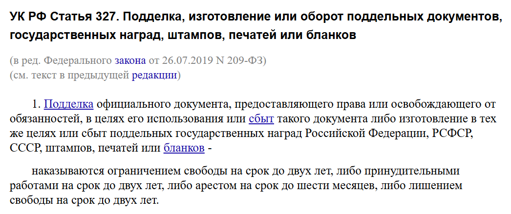 Согласно ст. 327 УК РФ, использование поддельного документа влечет серьезное наказание — вплоть до лишения свободы на 2 года. Поэтому каждый клиент Александра, который напишет в сообщество Телеграм Prawa70, рискует оказаться на скамье подсудимых.