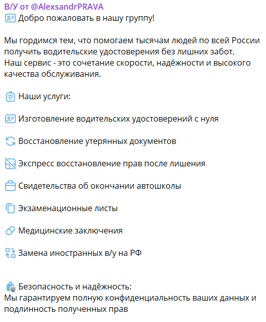 В сентябре 2025 года телеграм-канал Avtoshkolaprava70 не функционирует, хотя раньше в этом ТГК владелец данной площадки предлагал всем желающим получить «легальные водительские права РФ» за 10 дней. Давайте выясним, какие риски подстерегали клиентов Александра и почему с ним не стоило сотрудничать.