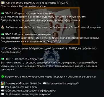 Один из материалов блога в Телеграм «Автошкола Права 70» описывает алгоритм сотрудничества. Клиент должен подать заявку, написав в Телеграм по адресу «Анастасия Права70», внести предоплату и ждать около 14 дней. Затем ему придут фотография готового удостоверения и ссылка на данные о нем в базе ГИБДД. Оплатив остаток суммы, водитель якобы получит права по почте.