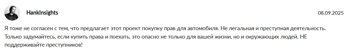 В интернете мало отзывов о канале «Александр Права 70». Один из подписчиков считает, что получать документы таким образом незаконно. Кроме того, водитель с «липовым» удостоверением угрожает жизни множества людей на дороге и нарушает уголовное законодательство.