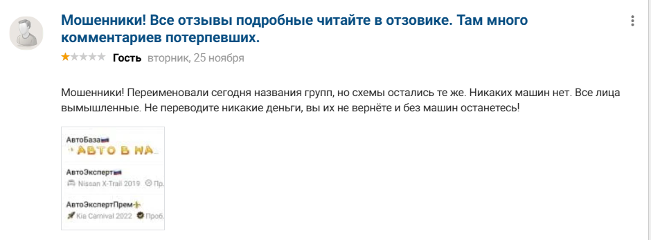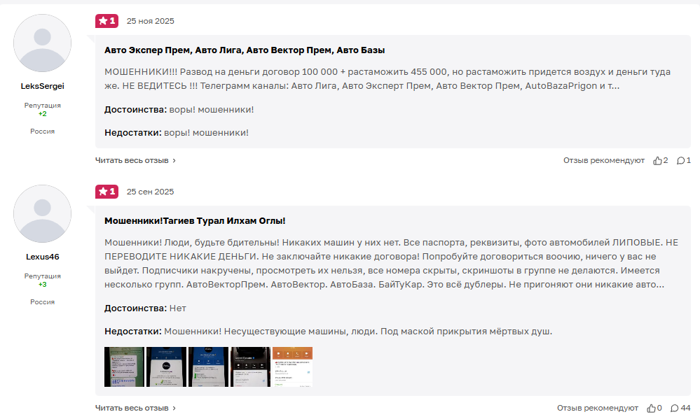 О проекте АвтоВекторПрем отзывы преимущественно негативные, хотя можно найти много положительных комментариев. Вероятно, это попытки мошенников обелить репутацию, чтобы продолжить развод. Схема банальна: после оплаты залога клиент ждет доставку авто, администратор сообщает ему, что требуется оплатить еще 455 тысяч за прохождение таможни, хотя изначально утверждает, что все расходы уже включены в стоимость авто. Дальше клиента блокируют, удаляют чаты, меняют ссылки аккаунтов и аватарки, даже ставят новые имена администраторов. Проект имеет множество названий и клонов: Авто Лига, AutoBazaPrigon, Авто Эксперт Прем и так далее.