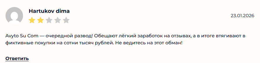 В сети присутствует ограниченное количество отзывов о avyto su com, что объясняется недавним запуском проекта. При этом все зафиксированные отклики носят отрицательный характер. Пользователи сообщают о потере сумм от десятков до сотен тысяч рублей. В ряде случаев для участия в «заданиях» оформлялись кредиты и микрозаймы.