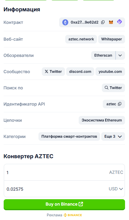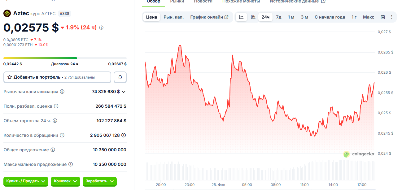 • текущий курс крипты Aztec: $0.02570;