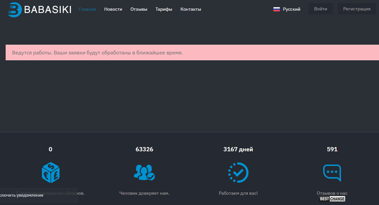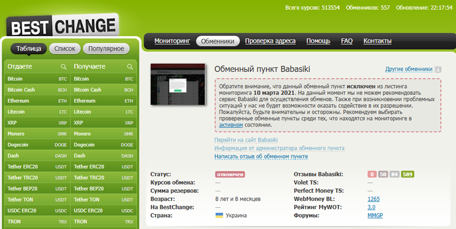 «Бабасики» – криптовалютный обменник, который работал почти 9 лет. Проект был зарегистрирован в Украине и предоставлял услуги на платформе мониторинга BestChange. Но в 2021 году был исключен из листинга обменников и приостановил услуги. Причины прекращения сотрудничества неизвестны .