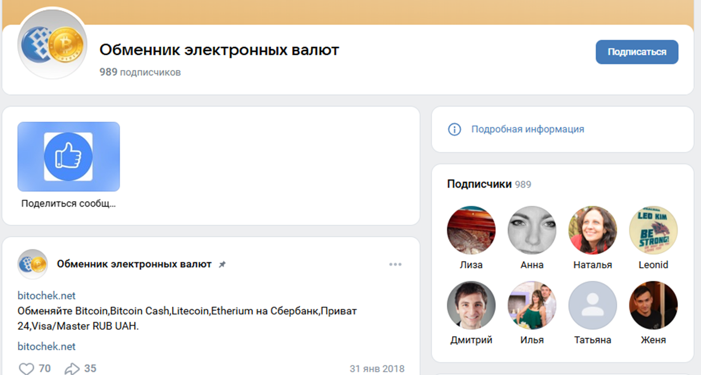 Единственный аккаунт обменника в соцсетях – это паблик Вконтакте, в тг у «Бабасики» канала нет.Но при посещении аккаунта обменника ВКонтакте выяснилось, что он не ведется с 2018 года. А ссылки на сайт обменника ведут нас на платформу с названием Bitochek.