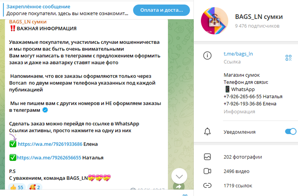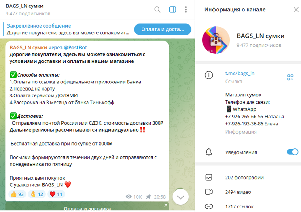 В данной статье мы проведем обзор деятельности проекта «Bags Ln Сумки» на Телеграмм, отзывы о работе которого, вызывают сомнение в надежности платформы. Владельцы интернет магазина предлагают купить брендовые сумки из натуральной кожи. В ассортименте присутствуют коллекции ручной работы от известных дизайнеров. Администрация осуществляет доставку во все отдаленные регионы РФ. Товар отправляют почтой России или СДЭК, стоимость доставки от 300 рублей. Покупки на сумму больше 8 000 рублей сотрудники пересылают бесплатно.