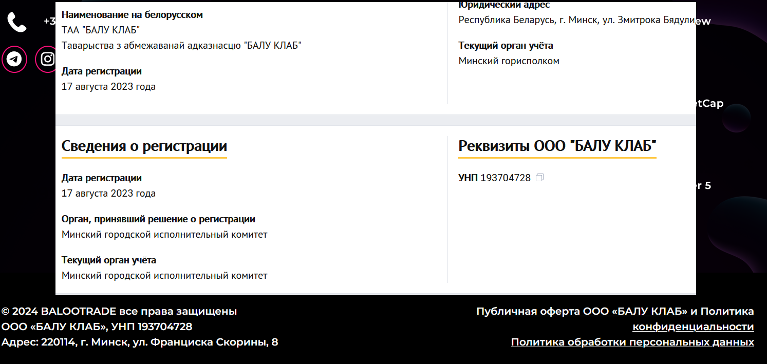 Базируется школа трейдинга Baloo в Беларуси, на сайте указано, что в 2024 году зарегистрирована компания ООО Балу Клаб. Записи о ней есть в госреестре, но там отличаются адрес, телефон и год создания с опубликованными в самой академии. Эти сведения могли быть изменены со временем и не обновлены в реестре, так как регистрационный номер совпадает.