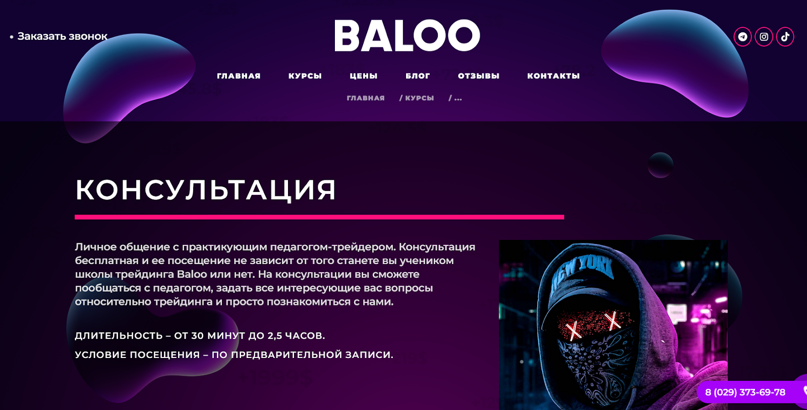 Baloo Trade работает на сайте с тем же названием в ссылке доменной зоны By. Зарегистрирован ресурс был в январе 2024 года. На сайте в современном стиле описываются доступные курсы, сама команда академии, юридическая информация и так далее.